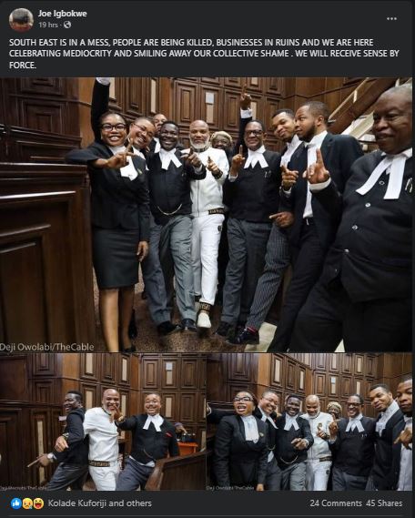 Joe Igbokwe has frowned at photos of Nnamdi Kanu, leader of the Indigenous People of Biafra posing with his legal team inside court yesterday.